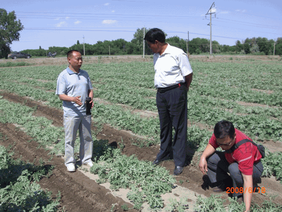 圖為:公司總經(jīng)理和總農(nóng)藝師在124團(tuán)9連打瓜地里察看打瓜苗長(zhǎng)勢(shì)