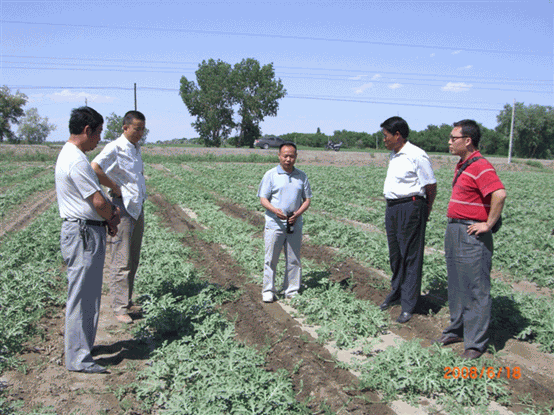 圖為:公司總經(jīng)理、總農(nóng)藝師和團(tuán)場(chǎng)技術(shù)員在124團(tuán)9連打瓜地里察看