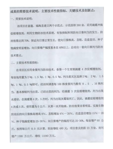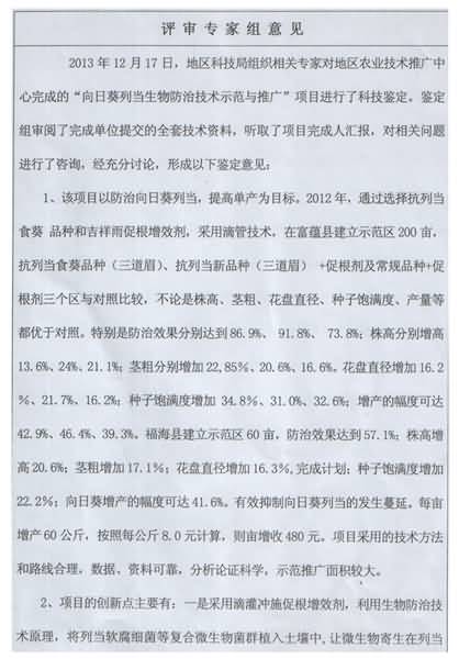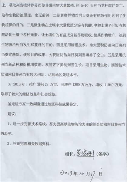 下面是新疆阿勒泰地區(qū)農(nóng)業(yè)技術推廣中心用成都華宏生態(tài)農(nóng)業(yè)科技有限公司生產(chǎn)的微生物菌肥成功攻克寄生在向日葵上的列當后,阿勒泰地區(qū)科技局對其成果的評審鑒定結(jié)果:具有先進性、創(chuàng)造性、成熟性、科學性,向日葵增產(chǎn)達到40%,其防治技術填補了阿勒泰地區(qū)空白。