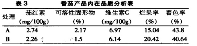 番茄品質試驗數(shù)據(jù)表明,茄紅素含量對照比處理要低0.48mg/l00g,可溶性固形物低0.67%,維生素C含量低0.83mg/100g,爛果率高5.38%。著色率低3.16%。