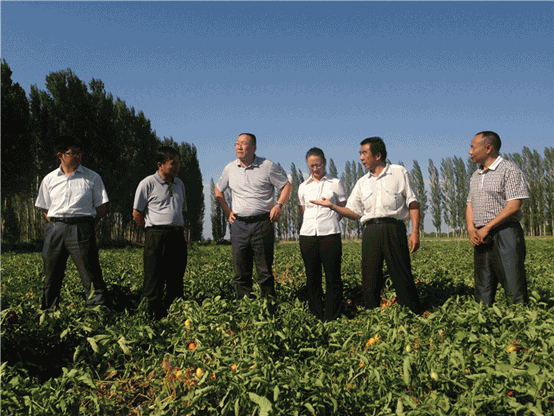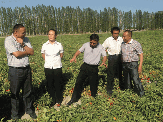 圖為:農(nóng)二師科技局馮局長(zhǎng)、21團(tuán)韓團(tuán)長(zhǎng)、趙科長(zhǎng)與成都華宏生態(tài)農(nóng)業(yè)科技有限公司李智強(qiáng)總經(jīng)理來到加工番茄試驗(yàn)地查看番茄長(zhǎng)勢(shì)。
