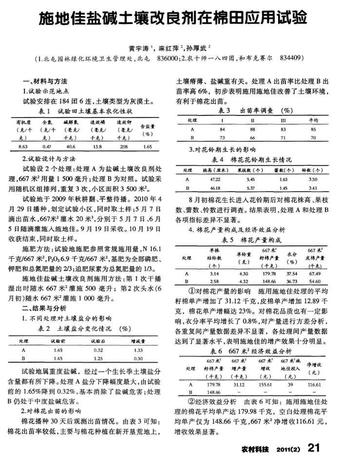 《農(nóng)村科技》2011年第2期 “施地佳”鹽堿土壤調(diào)理劑在棉田應(yīng)用試驗(yàn)