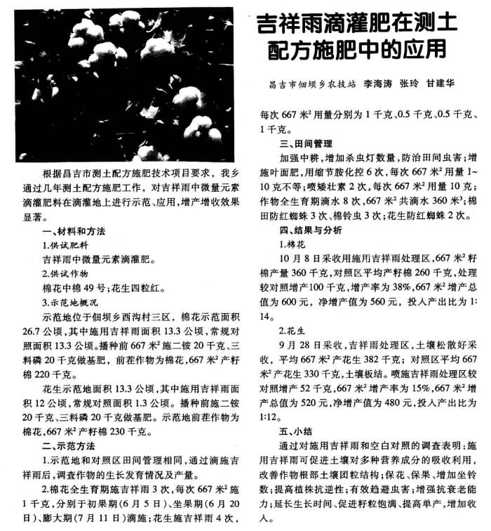 《農(nóng)村科技》2010年第4期 “吉祥雨”滴灌肥在測土配方施肥中的應(yīng)用
