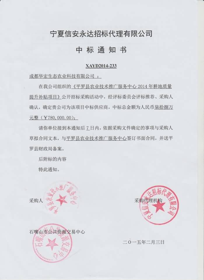 公司產(chǎn)品“施地佳”土壤調(diào)理劑在寧夏羅平縣中標(biāo)