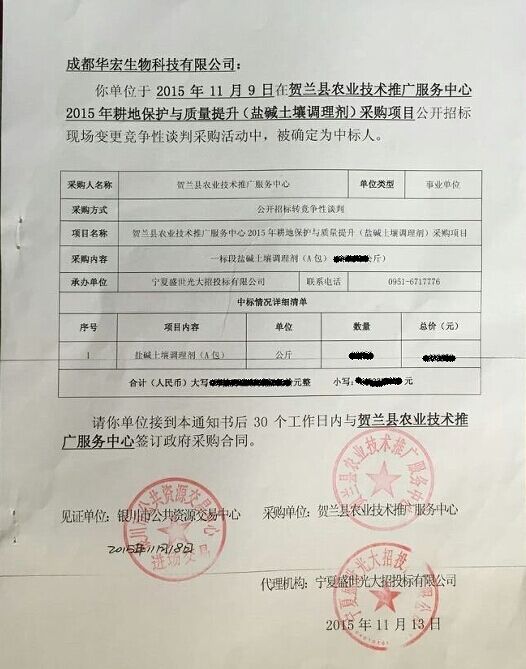 不久前,國內土壤調理劑產(chǎn)品研發(fā)生產(chǎn)先導型企業(yè)——成都華宏生態(tài)農(nóng)業(yè)科技有限公司,收到了一份特別的通知書,“賀蘭縣政府采購”幾個大字分外顯眼,無不讓人感覺這份通知書的分量十足。筆者了解到,這是該企業(yè)參與賀蘭縣農(nóng)業(yè)技術推廣服務中心“2015年鹽堿土壤調理劑采購項目”投標的中標通知書,該通知書的取得也意味著成都華宏在同類投標中連續(xù)四年中標,如此傲人的成績在業(yè)內還不多見。